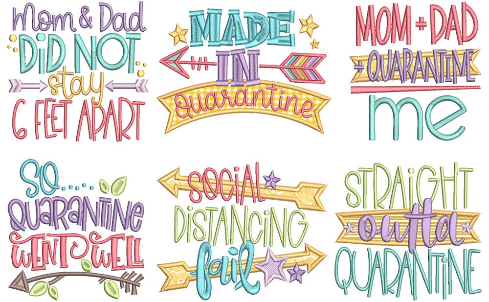 *Please note that the following designs contain applique components:Ā Made in quarantine / Mom + Dad + quarantine = Me / Social distancing fail / Straight outta quarantine / So.....quarantine went well.