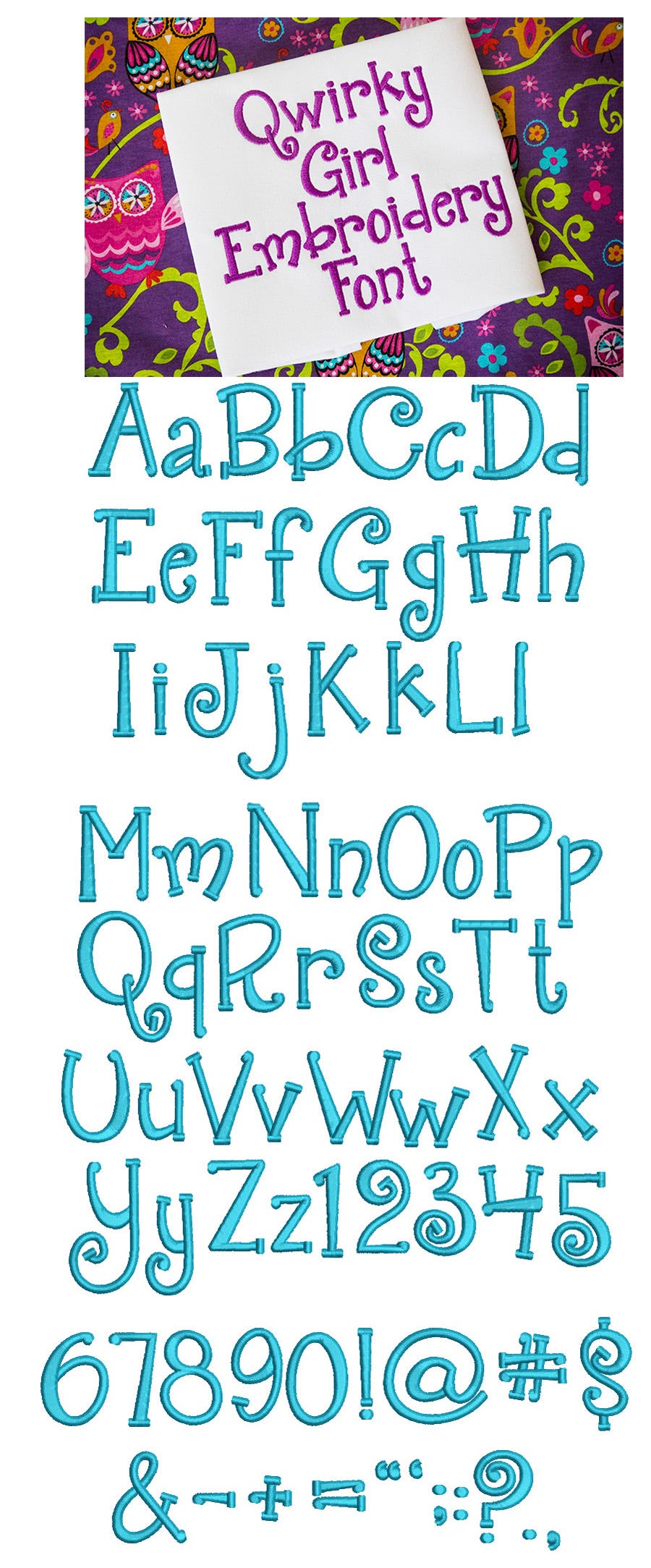 Just like the name, a cute and quirky font..a little bit girly! :) All of our font alphabets are 100% manually digitized to bring you maximum stitch quality.