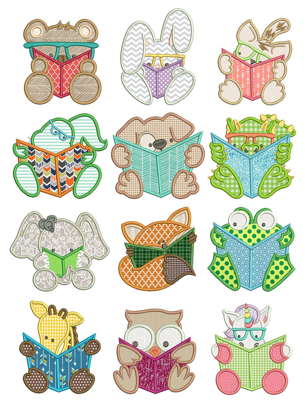12 seriously cute reading animals in applique!