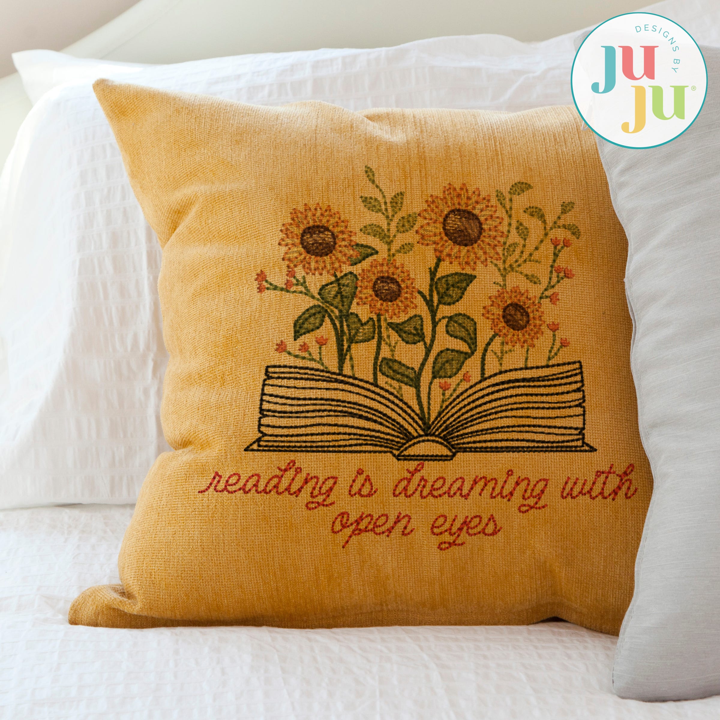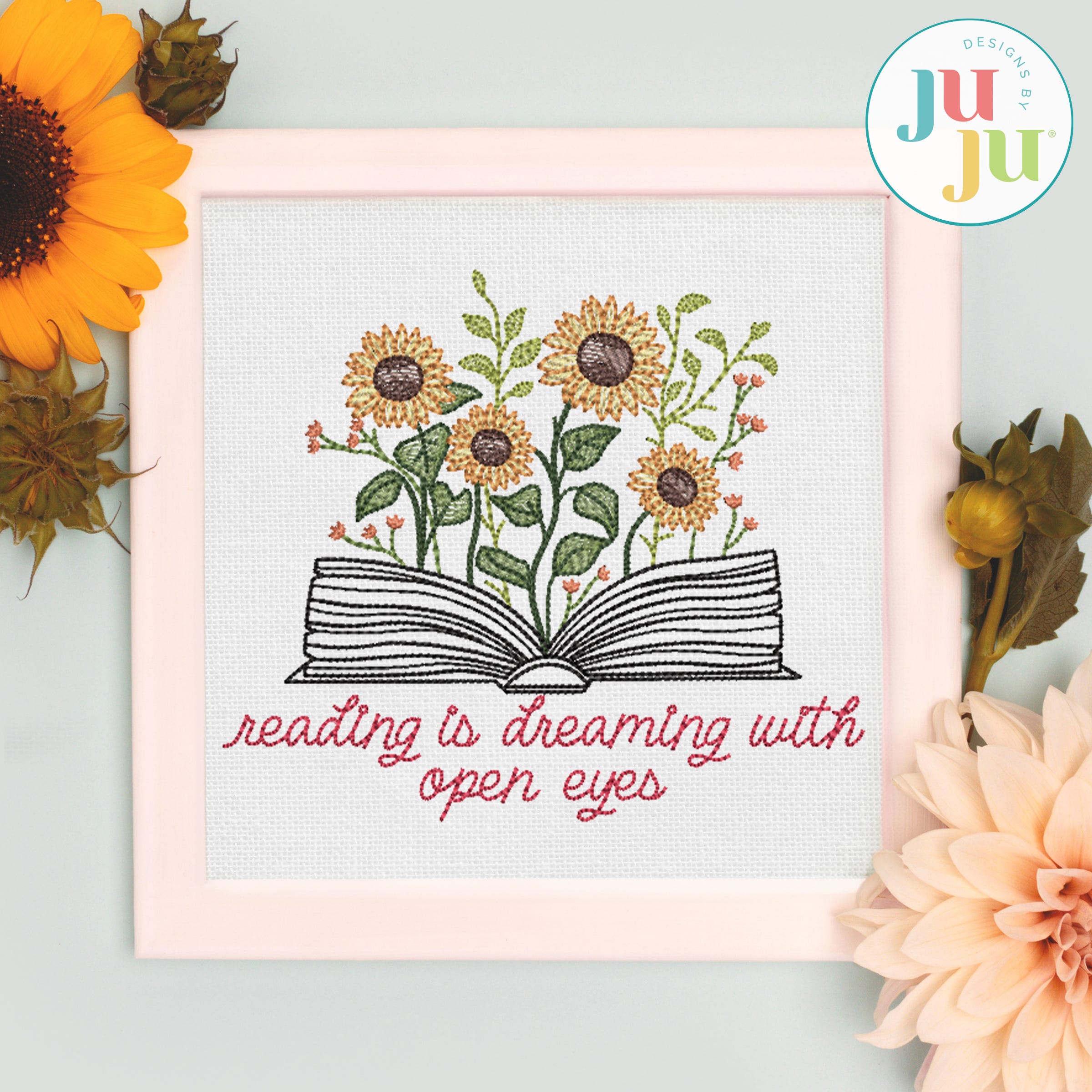 Reading is dreaming with open eyes! This single embroidery-only design features sketch fill sunflowers blooming out of a bean stitch book. The bean stitch lettering is included in the design file, as pictured.