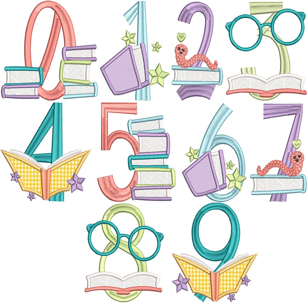 Personalize back to school projects with our Reading Applique Numbers. The split satin stitch numbers feature applique books and other embroidered details.