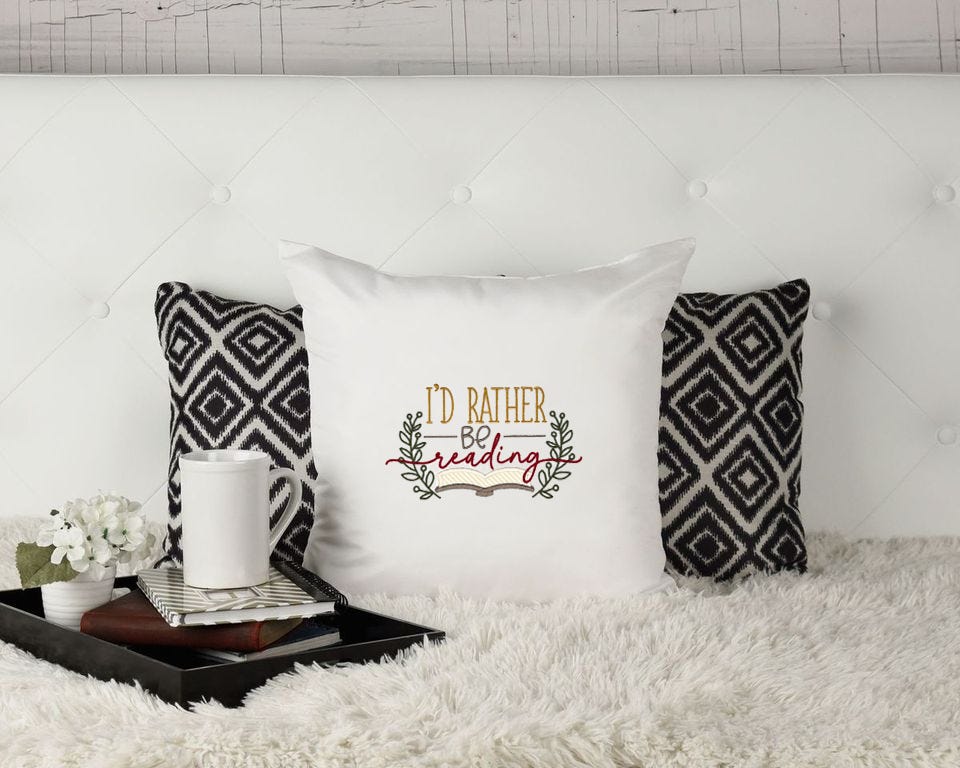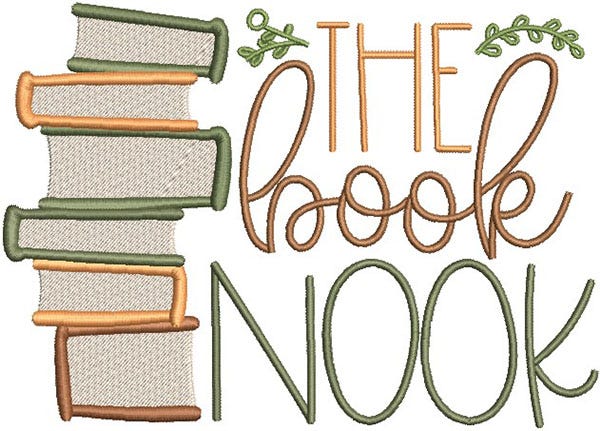These designs feature satin stitch lettering with fill stitch or applique elements for the pages of the books.