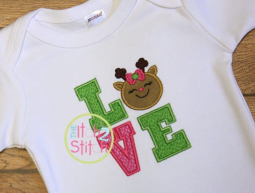The 5x7 and 6x10 sizes have applique bow and antlers - the 4x4 version; bow and antlers are fill stitch.