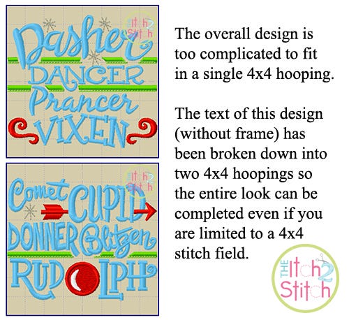 It is your responsibility to understand what you are purchasing and your hoop capabilities. Please note that "in the hoop" and "applique" designs can NOT be used with a repositionable / multi positional hoop. Once a design is downloaded we are unable to offer refunds.