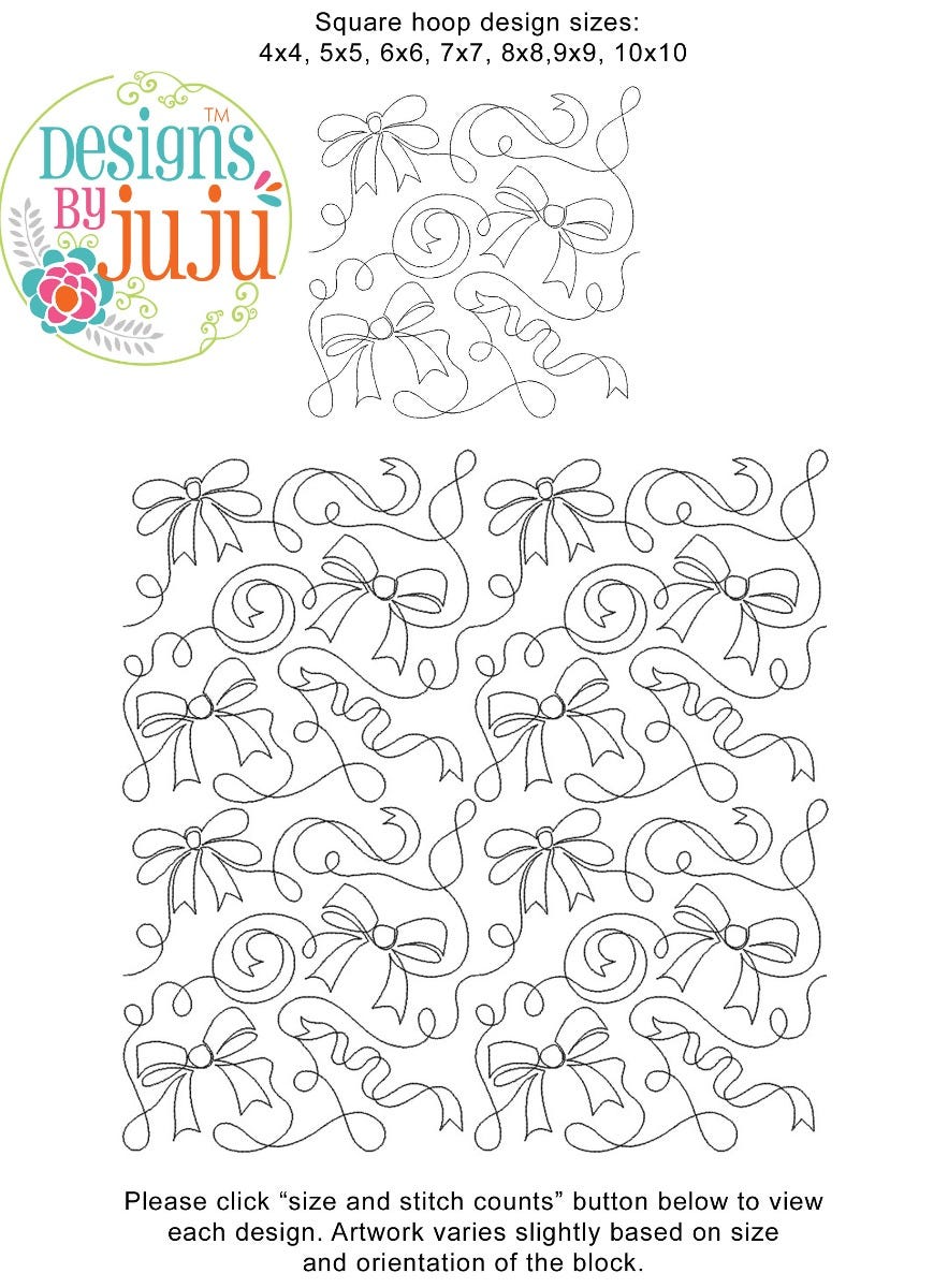 Please note: Both the scale of each pattern and arrangement of the motifs may vary based on the hoop size. Please click the "Size and Stitch Count" button to view the artwork for each size.