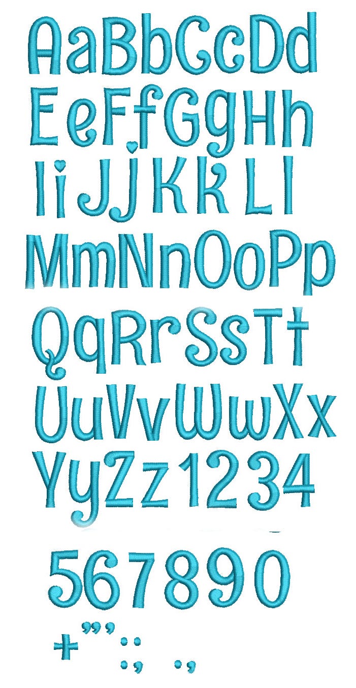 A cute and simple font with a bit of whimsy! All of our fonts are 100% manually digitized to bring you high quality stitch outs. Includes numbers and characters!