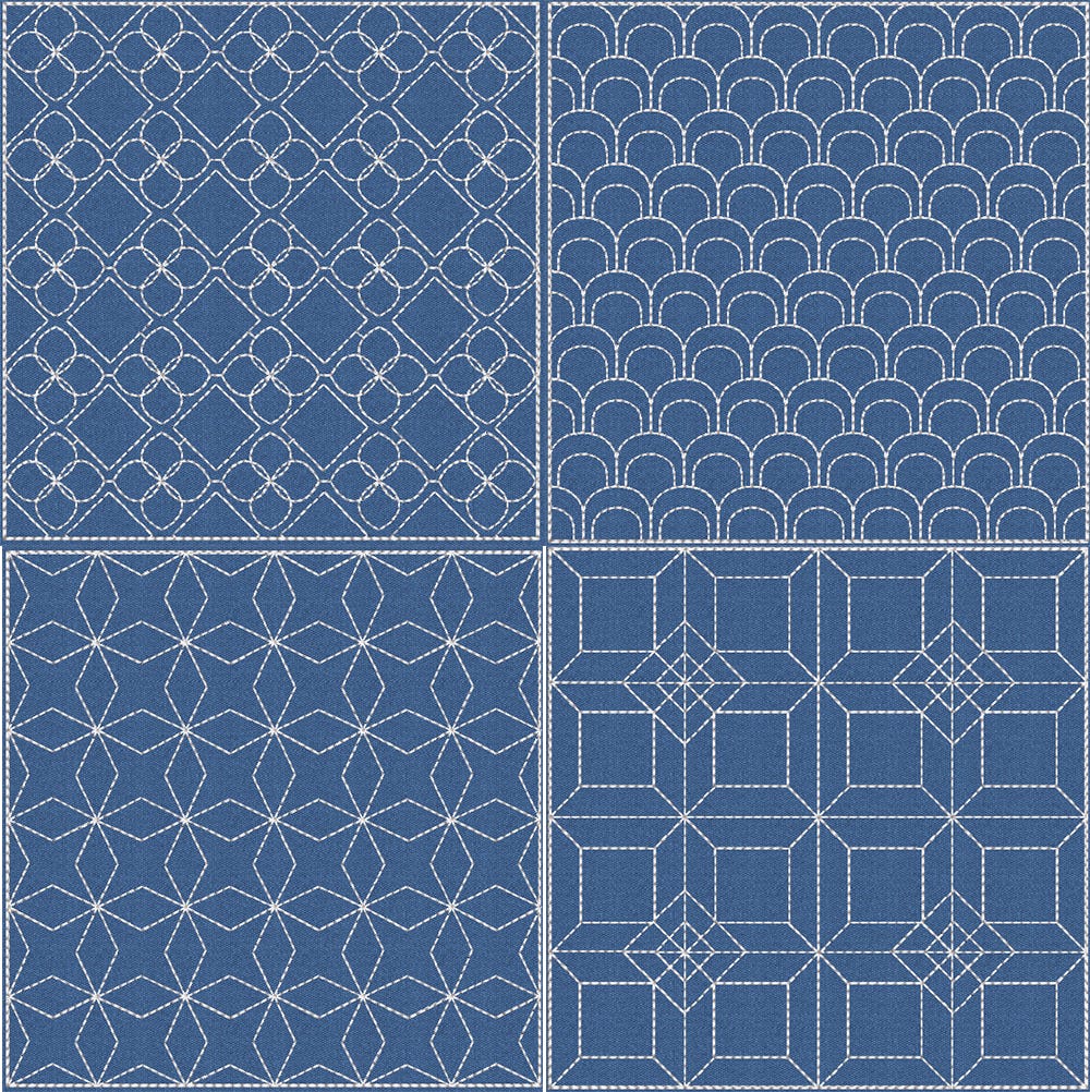 4 gorgeous Japanese sashiko style inspired quilt blocks in 6 sizes each: 4 inch, 5 inch, 6 inch, 7 inch, 8 inch and 9 inch