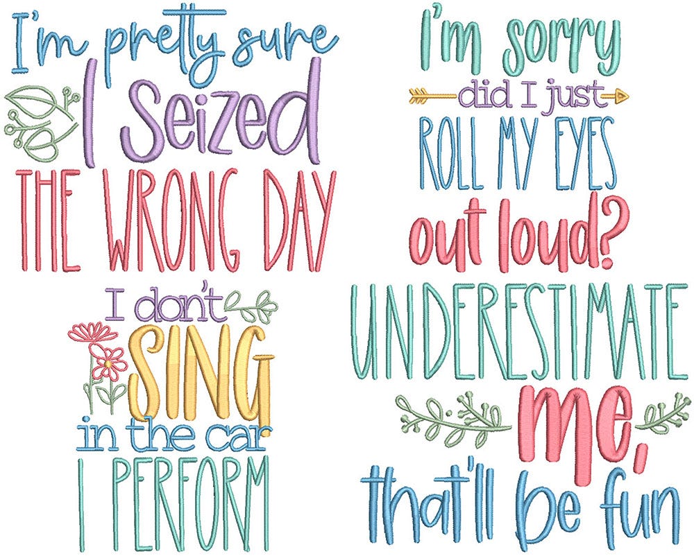 4 more sassy word art designs! These embroidery-only designs have satin stitch lettering with satin stitch design accents.