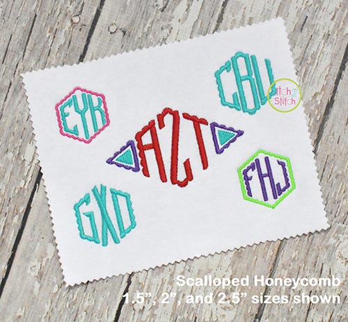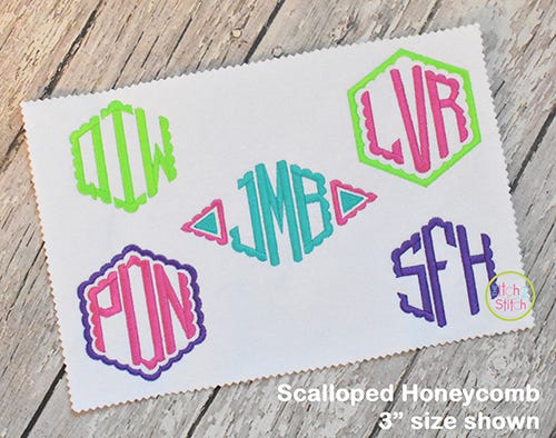 All three-letter combinations of all sizes fit in a 4x4 hoop. All frames fit in a 4x4 hoop except Frame 3 of the 2.5" and 3" sizes.