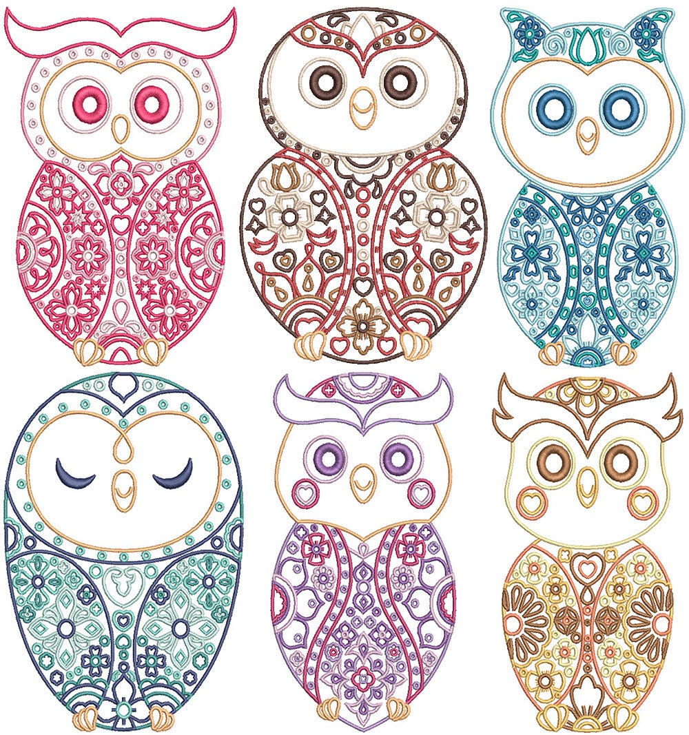 6 beautiful, Scandinavian inspired owls! These designs are embroidery-only with narrow satin stitches.