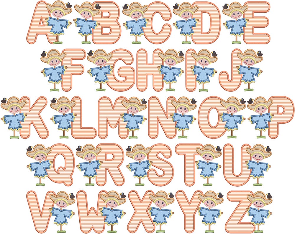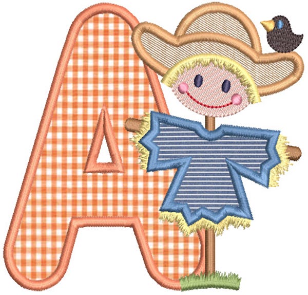 Our Scarecrow Boy Applique Alphabet features an applique scarecrow atop an applique letter. To maximize stitch efficiency, overlapped stitches have been removed, therefore the scarecrow cannot be skipped.