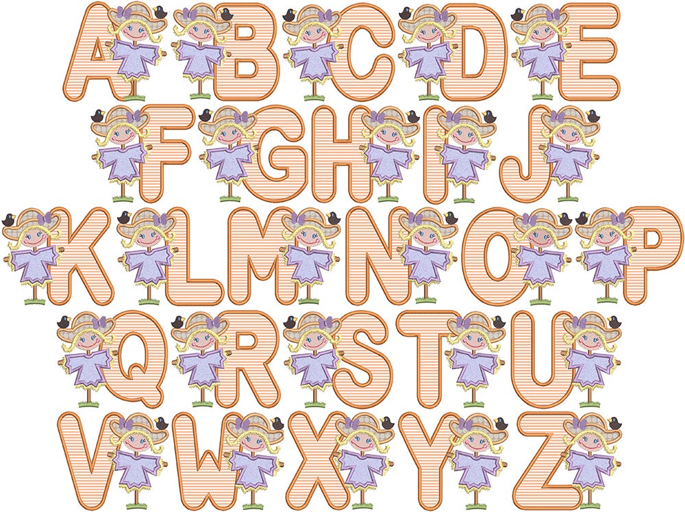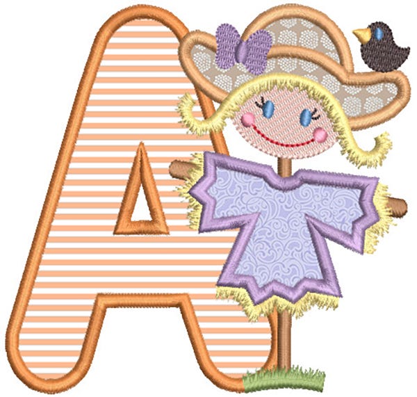 Our Scarecrow Girl Applique Alphabet features an applique scarecrow atop an applique letter. To maximize stitch efficiency, overlapped stitches have been removed, therefore the scarecrow cannot be skipped.