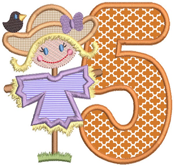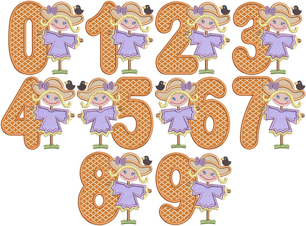Our Scarecrow Girl Applique Numbers feature an applique scarecrow atop an applique number. To maximize stitch efficiency, overlapped stitches have been removed, therefore the scarecrow cannot be skipped.