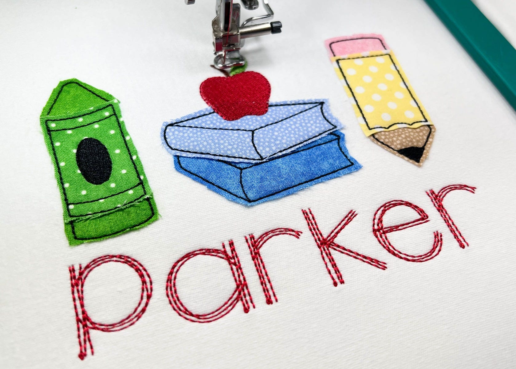The School Kit includes thirteen appliques (Apple, Book, Books with Apple, Bus, Crayon, Glue, Mini Grad Cap, Notebook, Owl, Pencil, Ruler, Scissors, Worm) and five embroidery-only accents (Mini Apple, Mini Crayon, Mini Diploma, Mini Pencil, Mini Worm).
