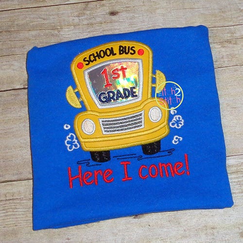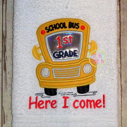 All text shown is included in the design file.Ā On the 4x4 size "SCHOOL BUS" is bean stitch; on the 5x7 and 6x10 sizes "SCHOOL BUS" is satin stitch. The grill on the front of bus is two color stops: satin lines on top of a fill stitch.Ā