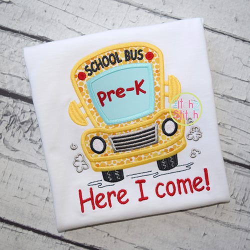 All text shown is included in the design file.Ā On the 4x4 size "SCHOOL BUS" is bean stitch; on the 5x7 and 6x10 sizes "SCHOOL BUS" is satin stitch. The grill on the front of bus is two color stops: satin lines on top of a fill stitch.Ā