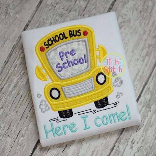 All text shown is included in the design file.Ā On the 4x4 size "SCHOOL BUS" is bean stitch; on the 5x7 and 6x10 sizes "SCHOOL BUS" is satin stitch. The grill on the front of bus is two color stops: satin lines on top of a fill stitch.Ā