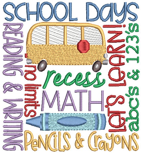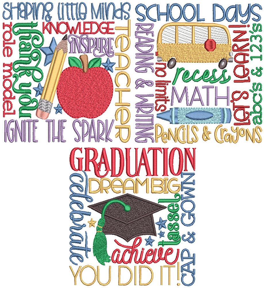 3 playful and sweet school inspired subway art designs! These embroidery-only designs have satin stitch lettering with sketch, satin and fill stitch design accents.