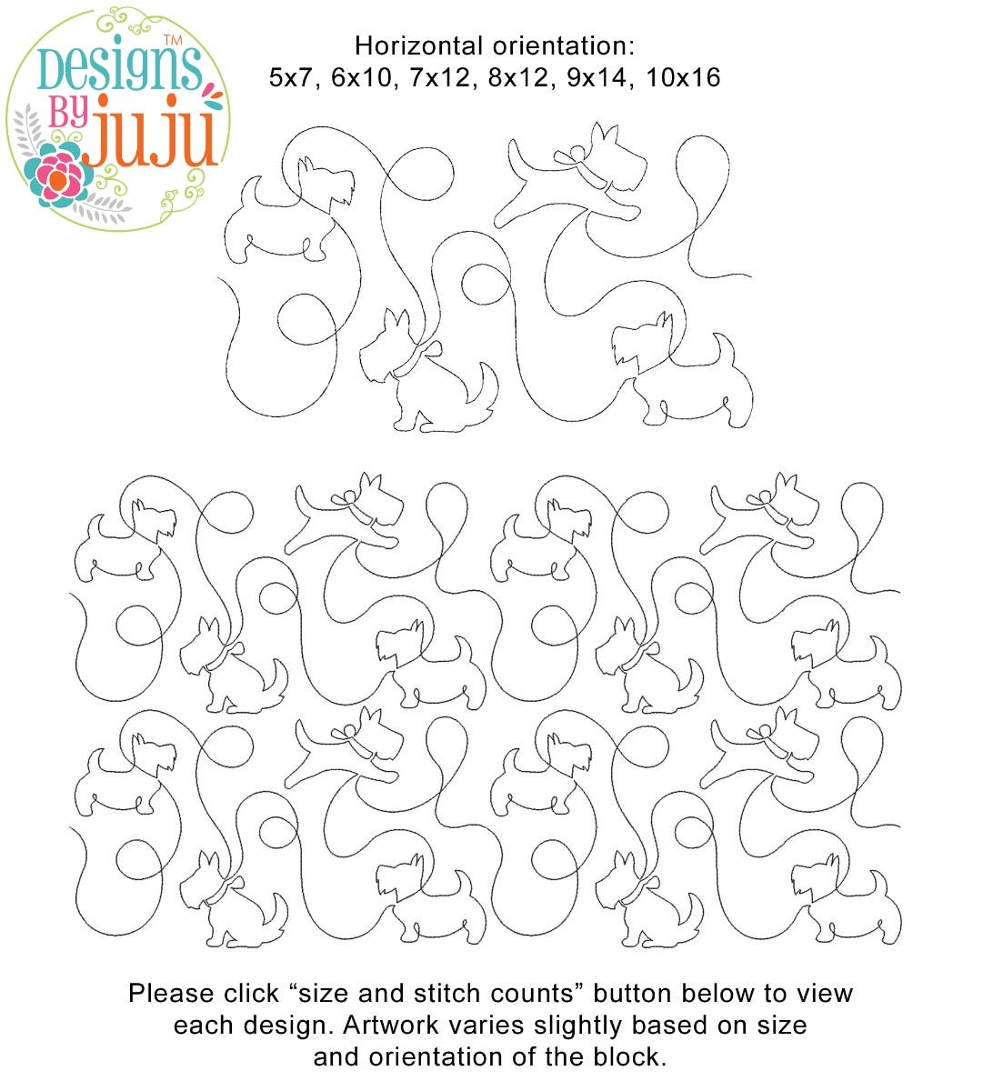 Please note: Both the scale of each pattern and arrangement of the motifs may vary based on the hoop size. Please click the "Size and Stitch Count" button to view the artwork for each size.