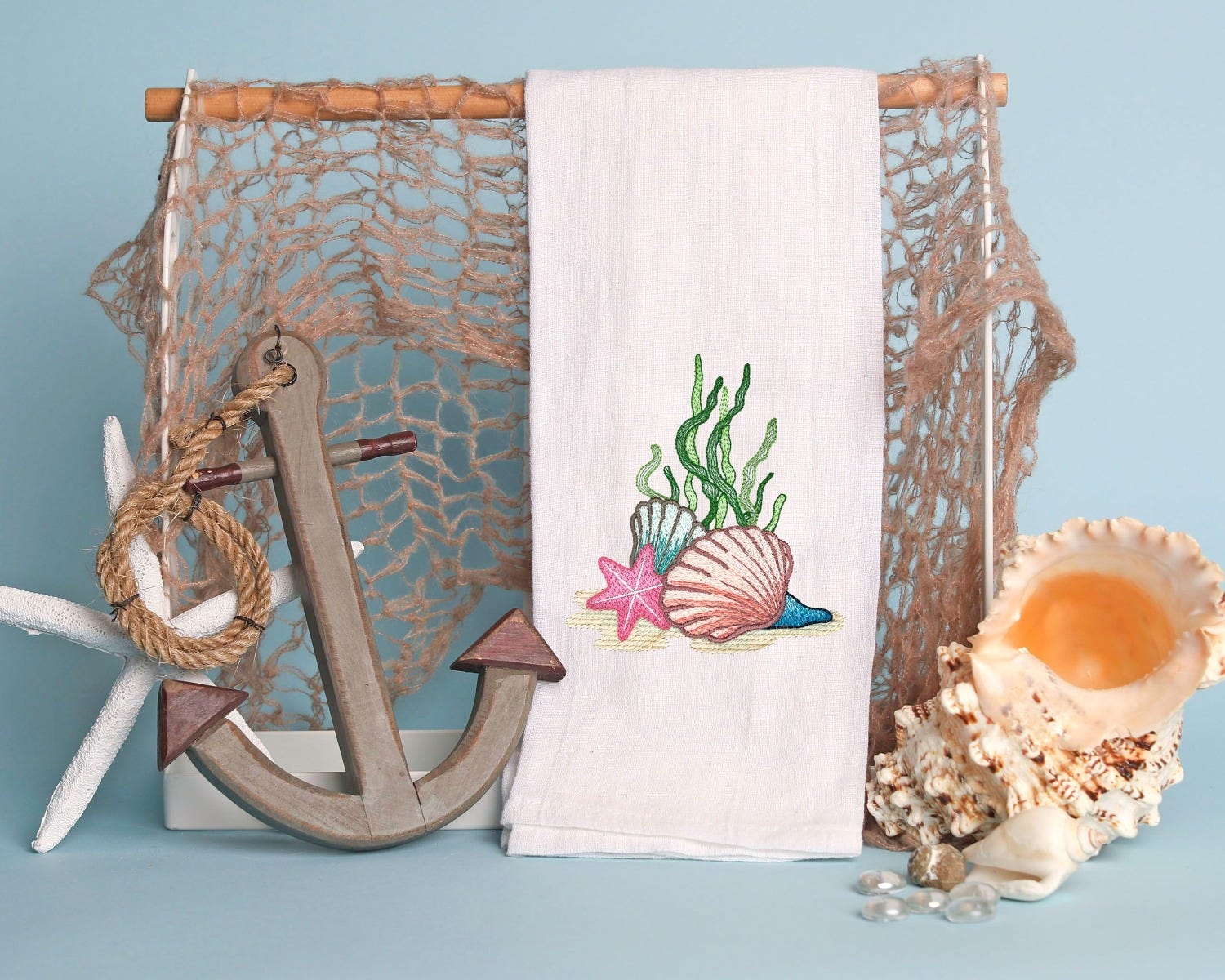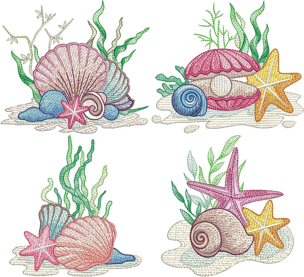 4 beautiful sea shell designs featuring a blend of sketch and satin stitch details.