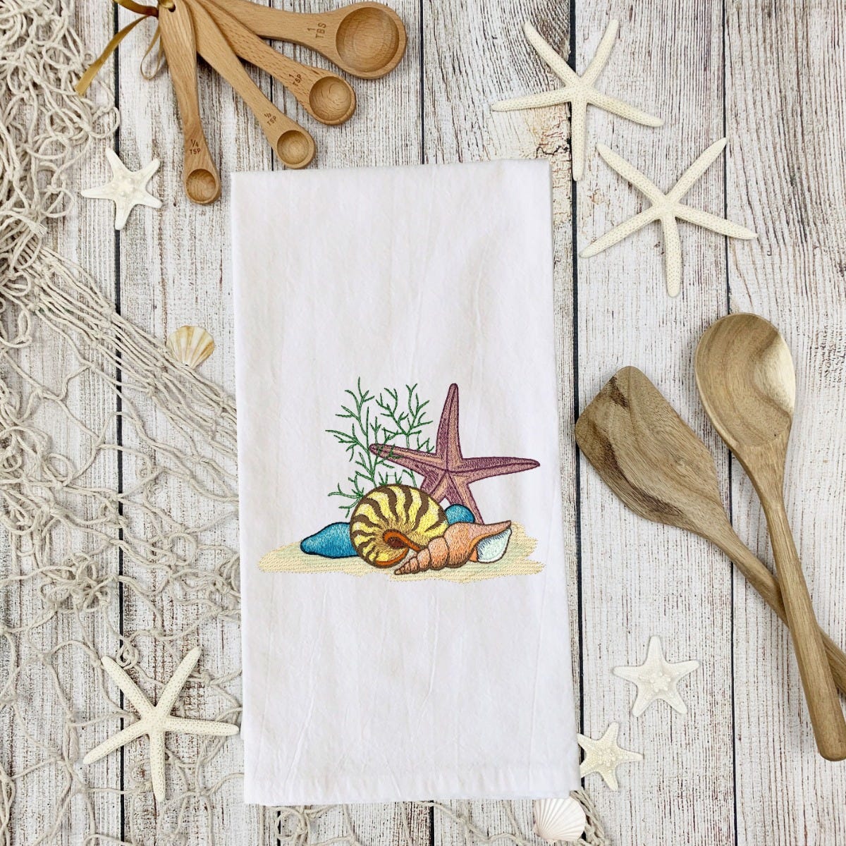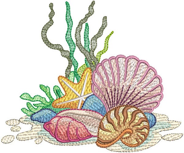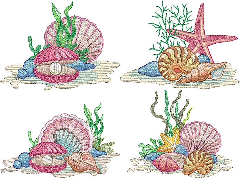 Four more beautiful sea shell designs featuring a blend of sketch and satin stitch details.