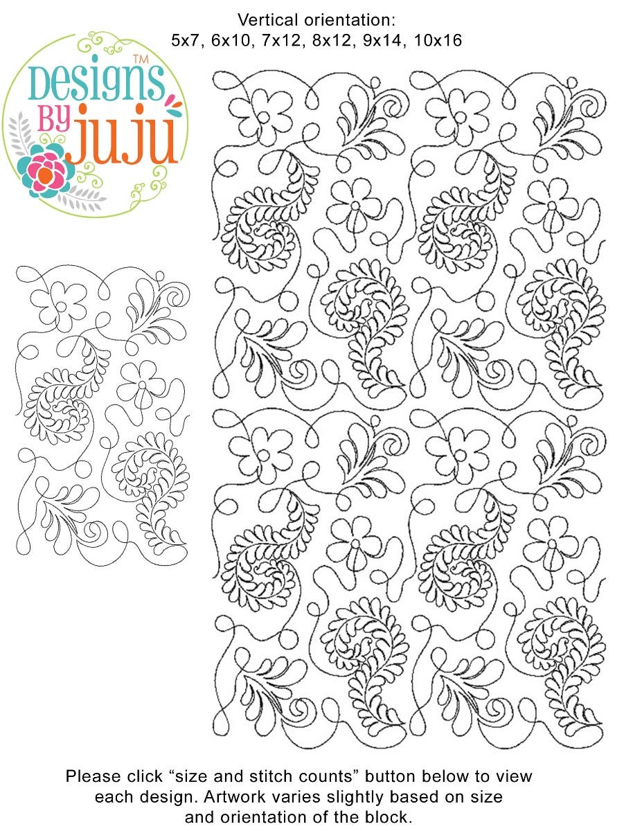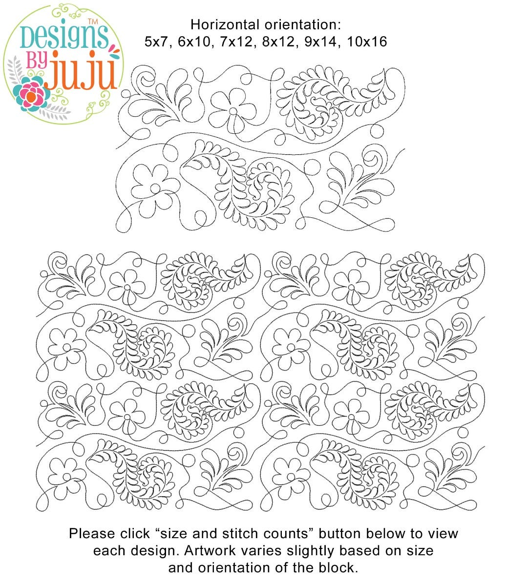 Each one of our End-to-End Quilting™ embroidery designs is an originally created design available in a large variety of block sizes. Every block is one continuous single-run line running edge to edge beginning on the left and exiting on the right. There is NO backtracking or double stitching. Each size block has been engineered and manually digitized by our team for EXACT edge-to-edge quilting precision so that when they are aligned properly in your hoop, you cannot tell where one block ends and the next one begins! ADDITIONALLY, the art has been created for each size so that when the rows are stacked on top of each other, it provides a practically seamless, professional, allover quilting effect that mimics (E2E) pantographs so you can do edge-to-edge quilting on your embroidery machine!