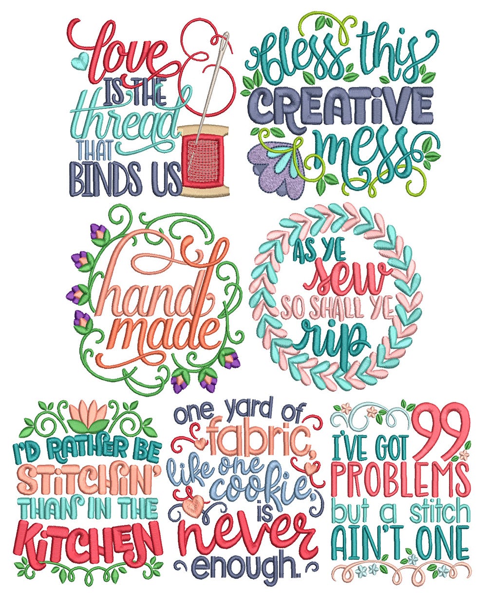 7 more trendy sewing sayings for those who love to stitch their heart out! *Please note some of these designs contain applique components.