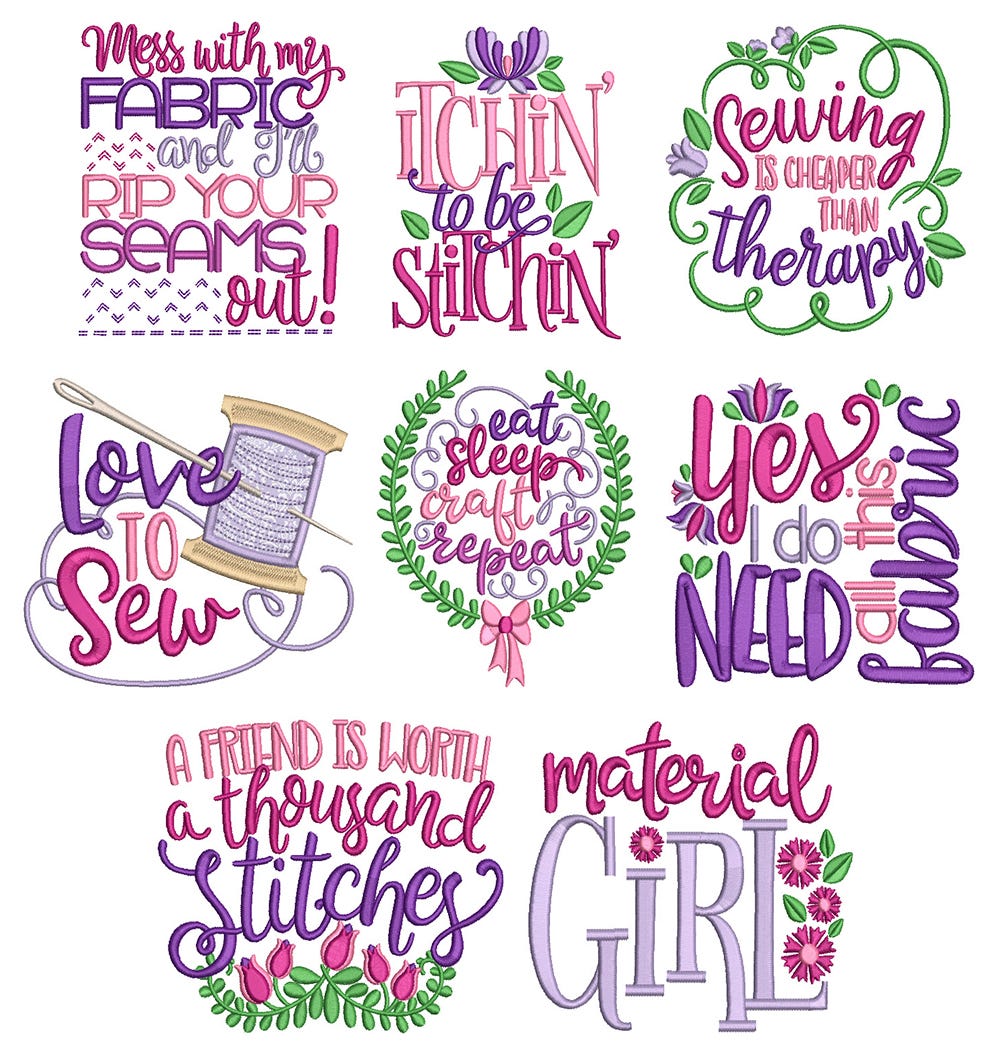 8 more trendy sewing "sayings" for those who love to stitch their heart out!Ā *Please note some of these designs contain applique components.