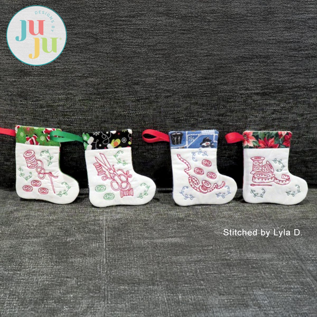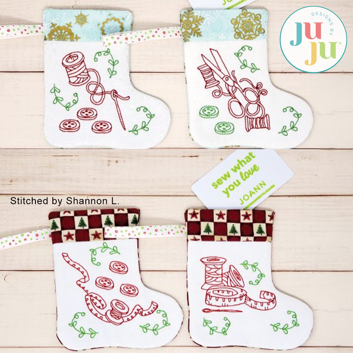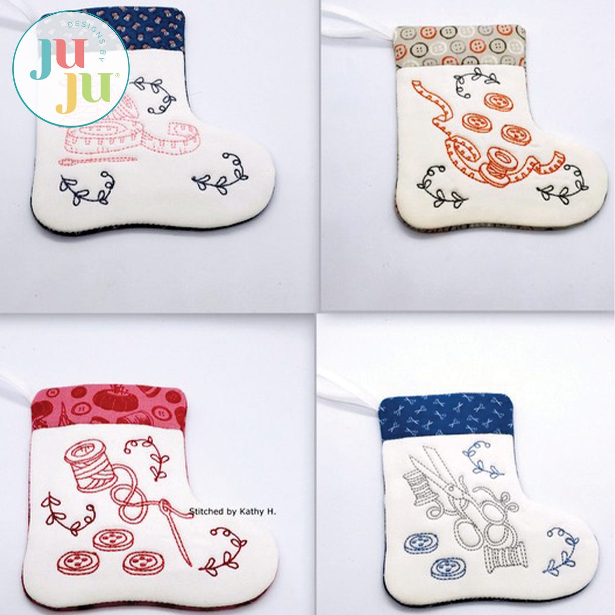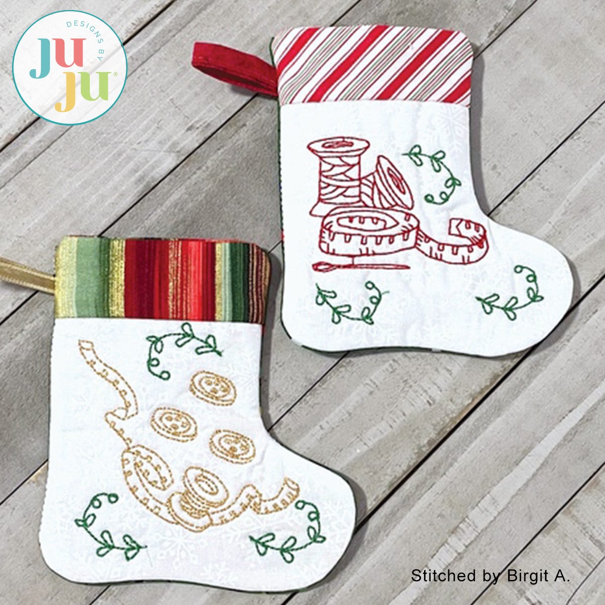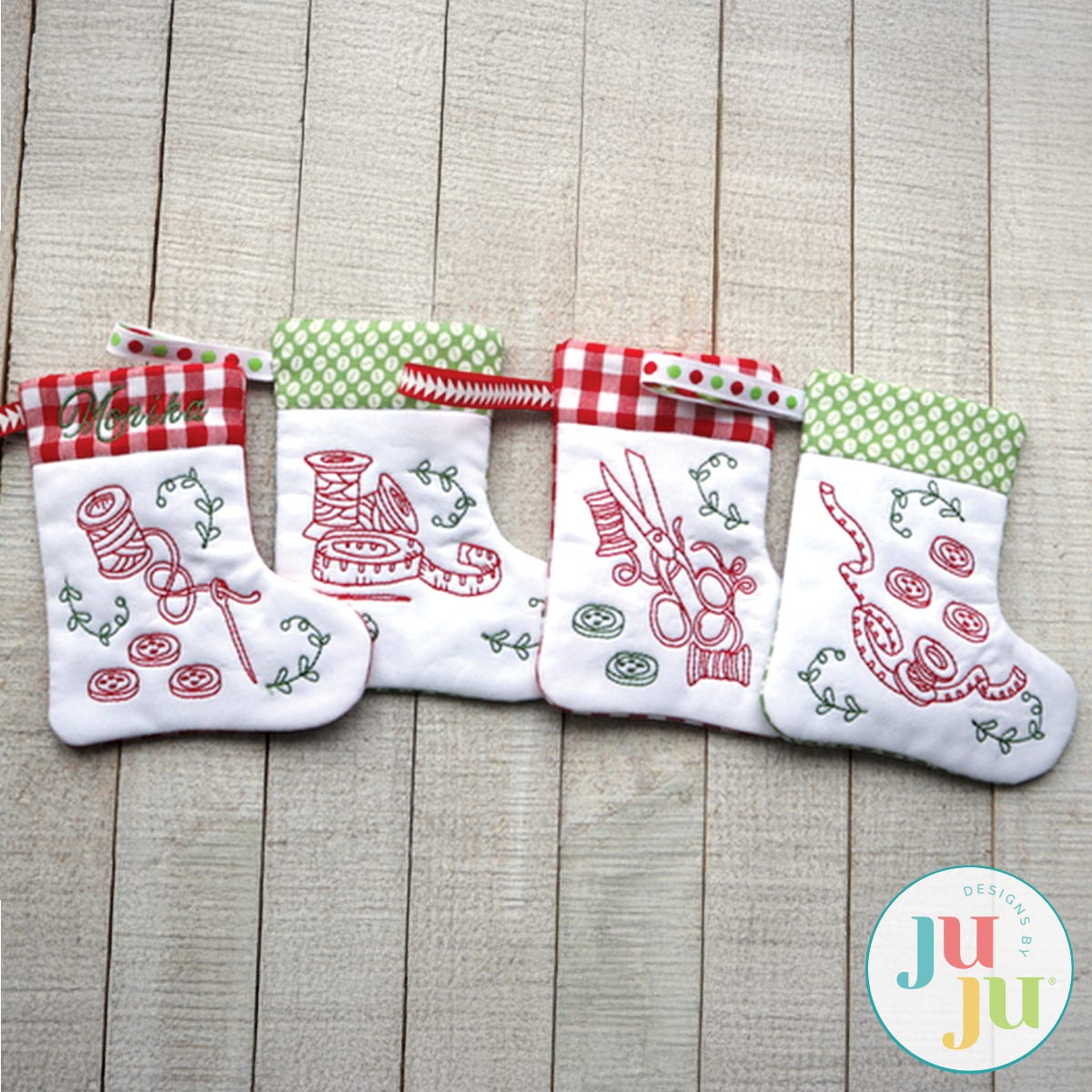 Are you looking for a small gift for your sewing friends? These adorable sewing themed stockings may just be what you are looking for. They stitch up quickly and require no further hand or sewing machine stitching. The little stockings are fully lined; no seams, no raw edges visible. Perfect for filling with a sewing novelty or candy canes, mints, chocolates, all sorts of goodies (including gift cards). There are a total of 5 stitch files in this download: 4 with a stitch motif and 1 plain one that you can use to showcase Christmas fabrics. You can hang this little stocking from your Christmas tree. It can also be used as a place card for your Christmas dinner table. Only one hooping is required.