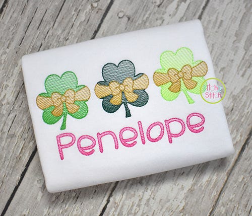 The light and airy "sketch" fill pattern allows for a quick stitch out. The space between each line of stitching varies such that it is more dense at the bottom of the object than top to create the shading effect. The objects are finished off with a triple bean stitch outline.