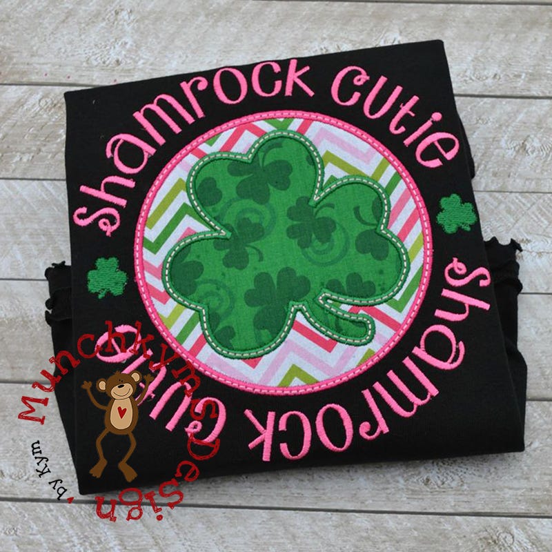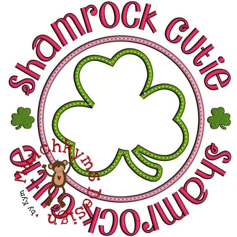 This two fabric applique features a bean stitch accent line on top of the satin stitches. The "Shamrock Cutie" text is included in the design file.