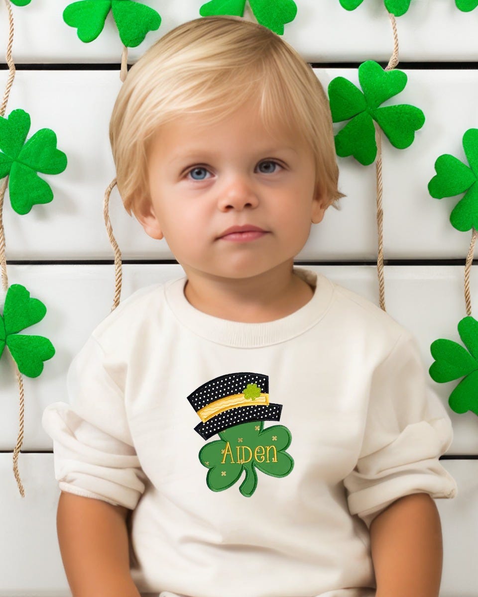 An applique shamrock wearing a top hat design, perfect for St. Patrick's Day