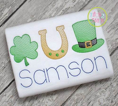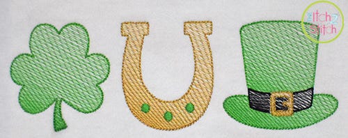 The light and airy "sketch" fill pattern allows for a quick stitch out. The space between each line of stitching varies such that it is more dense at the bottom of the object than top to create the shading effect. The objects are finished off with a triple bean stitch outline.
