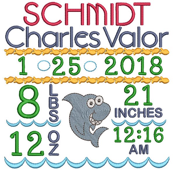 You will receive the embroidery templates shown. Customize with your own names, date, weight and length with fonts from your purchased collection or those that are built in to your embroidery software.Ā I have included a "basting" stitch as the first step so that while you are customizing in your software, you can ensure to stay with the parameters of your hoop. Skip the first step upon stitching.