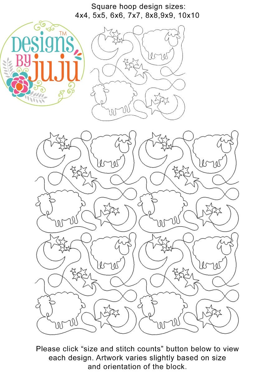 Please note: Both the scale of each pattern and arrangement of the motifs may vary based on the hoop size. Please click the "Size and Stitch Count" button to view the artwork for each size.