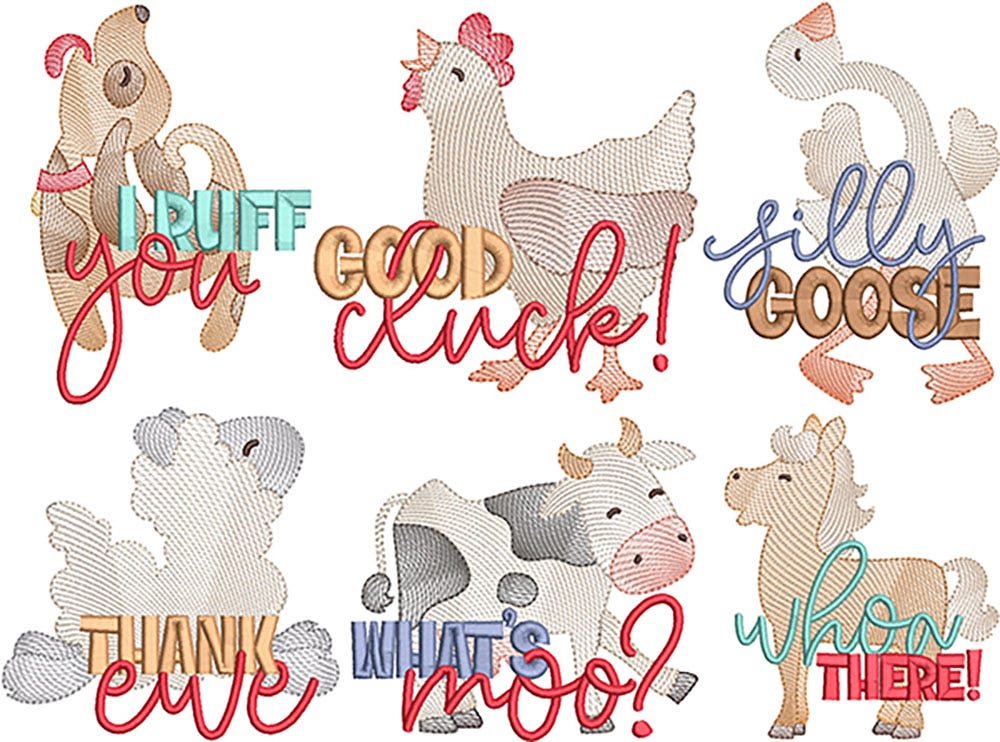6 sweet and silly animal word art designs in our popular sketched style! These designs feature sketch fill animals and satin stitch lettering.