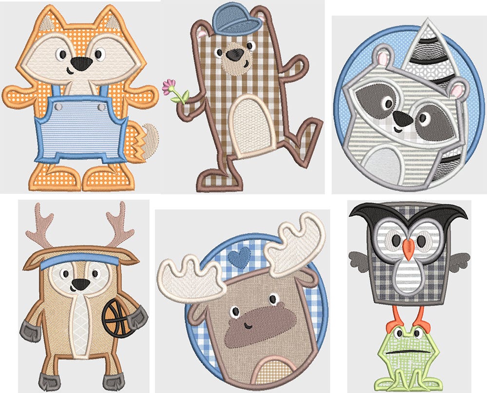 6 sweet and silly chubby animal friends in applique!