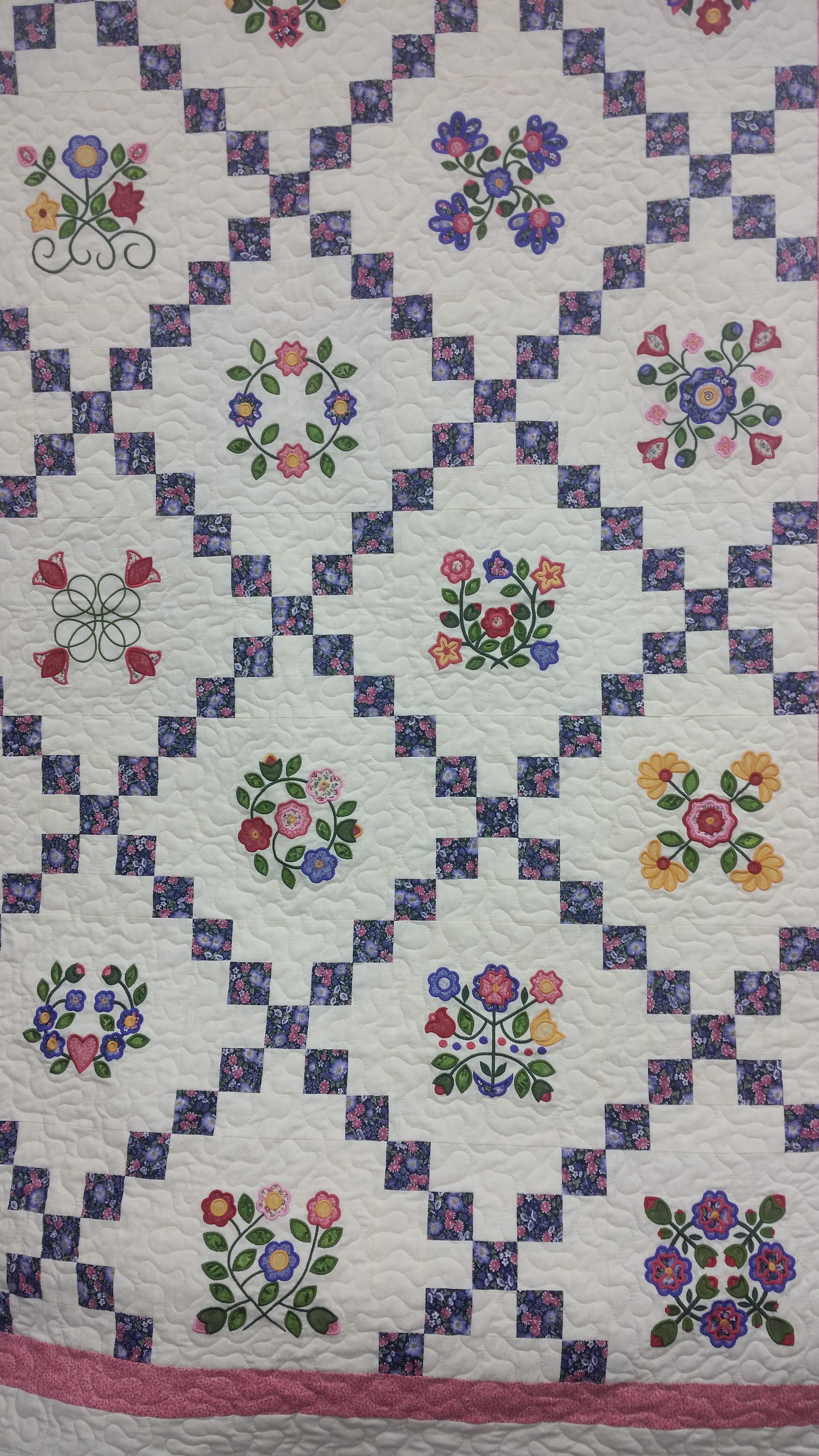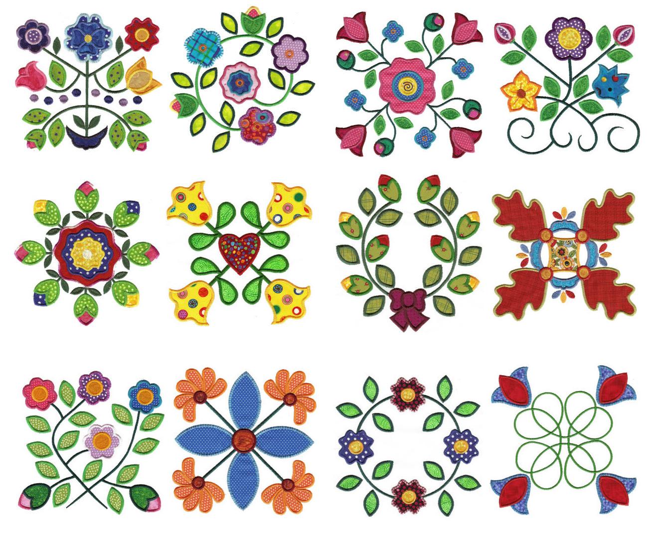 Based on the old traditional Baltimore Album blocks, we have fashioned 12 "baltimore album style blocks" for all you quilters! Each block comes in three sizes, as stated above. Use traditional album block colors or some more modern, funky colors as shown below. Also look great in Aunt Gracies fabrics! Have fun!