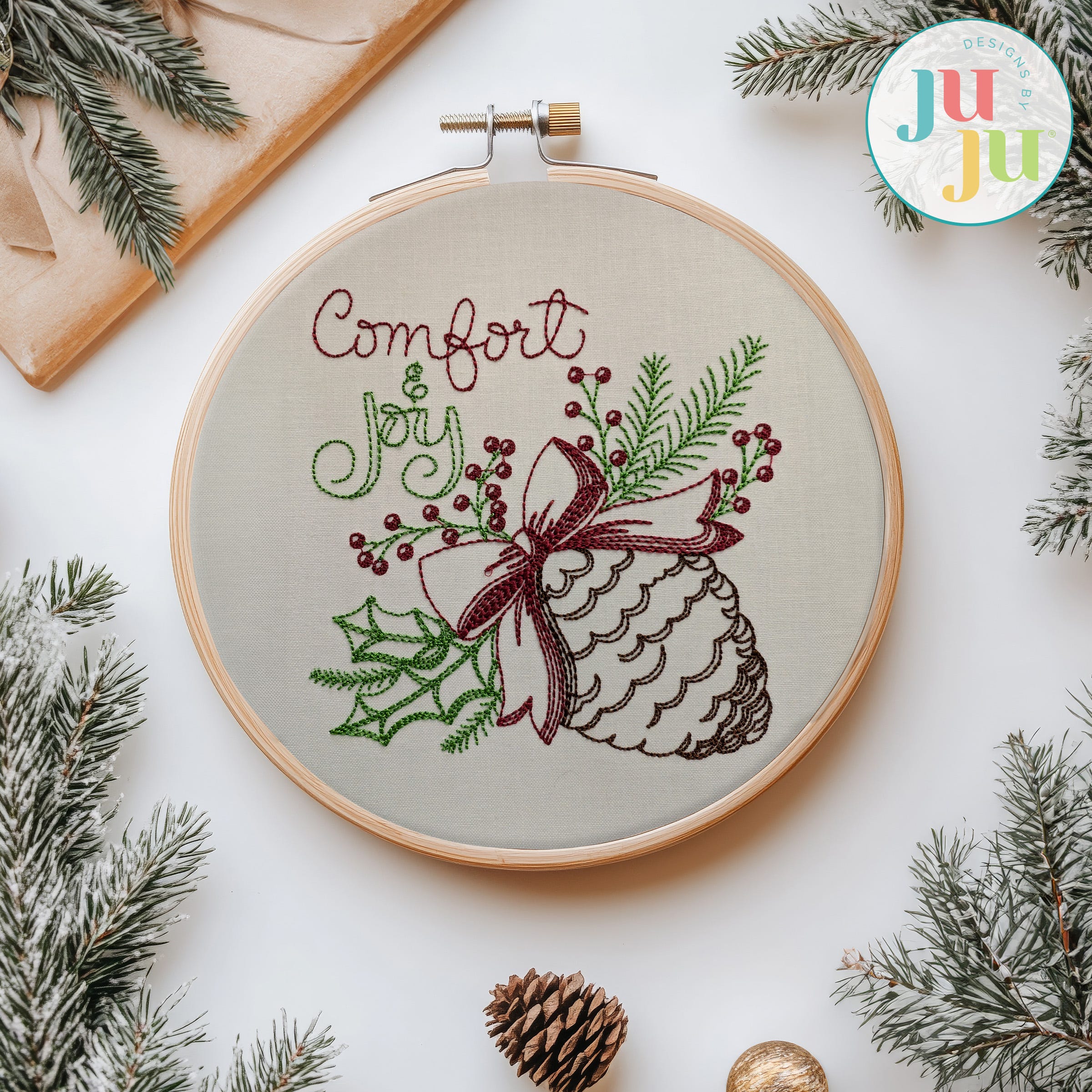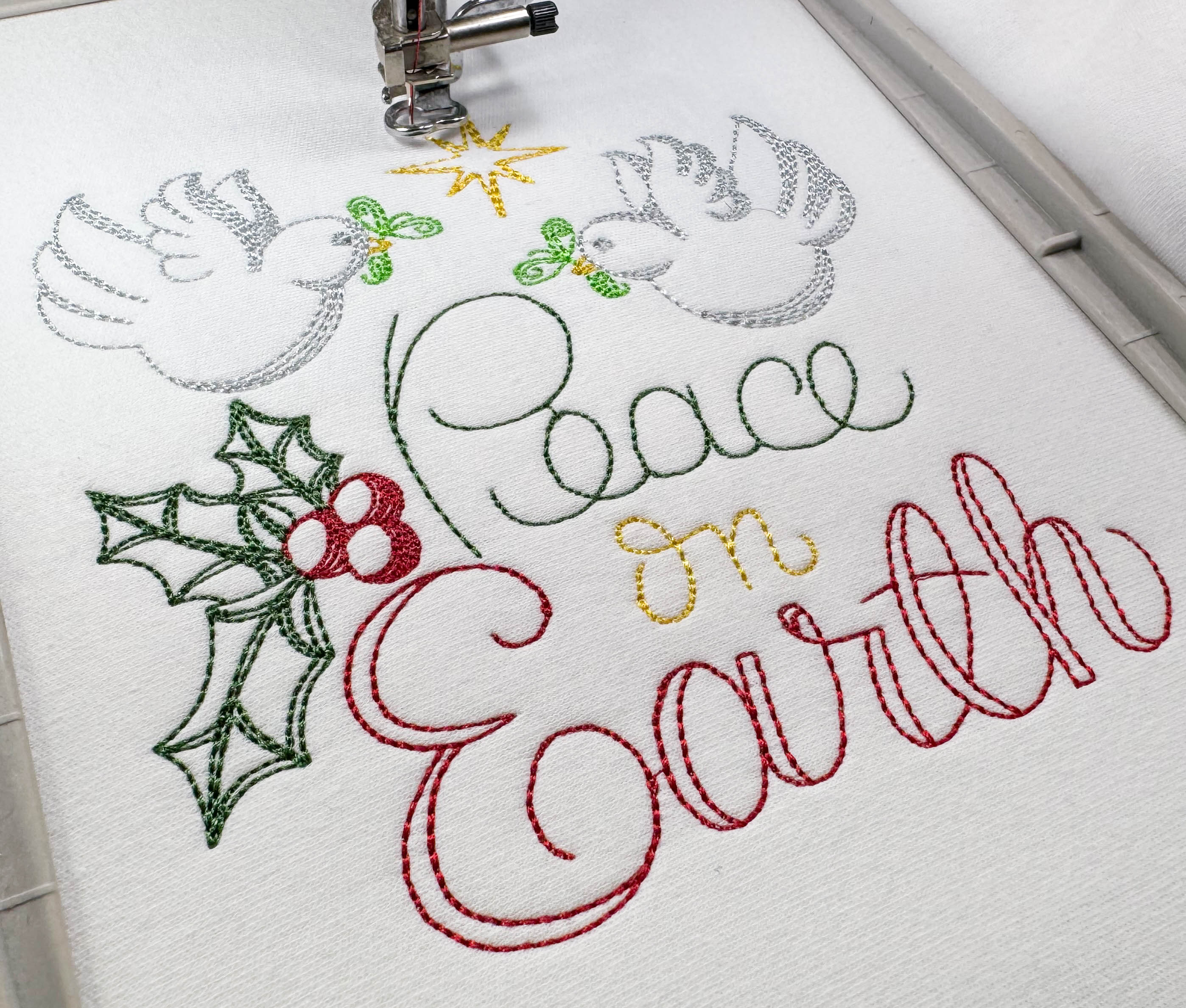 Celebrate the holidays with four fun Christmas themed designs. Featuring doves, a snowman, a pinecone and a mitten, they are perfect for vintage Christmas projects. These are bean stitch designs for a hand-stitched look. The lettering (Comfort and Joy, Jolly Happy Soul, Peace on Earth, Cozy Winter Wishes) is included in the design file as pictured. 4 sizes included: 4x4, 5x7, 6x10 and 8x8