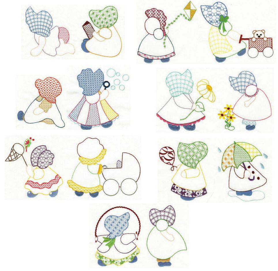 A great set for all sunbonnet lovers! Here is a lovely set of "classic" style sunbonnets done in colorwork for the 5x7 hoop.