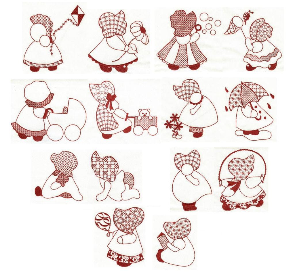 A great set for all sunbonnet lovers! We have had many requests for redwork sunbonnets in a more "classic" sunbonnet style. Here are 14 adorable redwork designs for the 5x7 hoop.