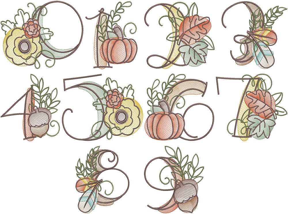 Our Sketch Fall Numbers feature satin stitch lettering with lovely fall design elements that are a blend of sketch fill, stem stitch and satin stitch details. The outlines are intentionally offset from the oval shaped fills as part of the stylistic artwork, as pictured.