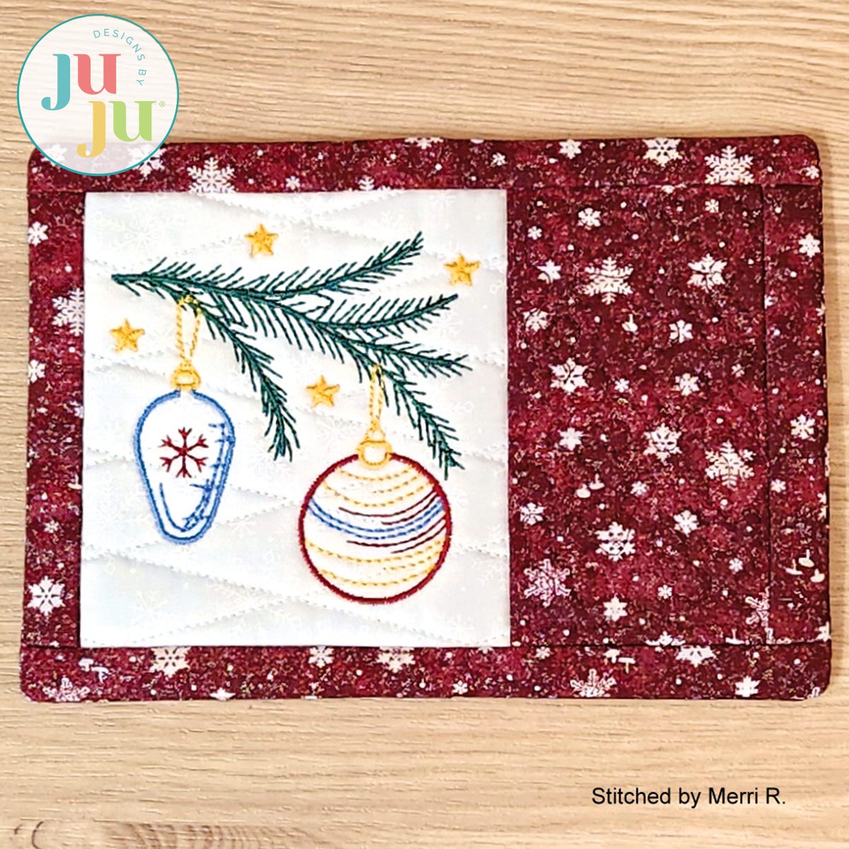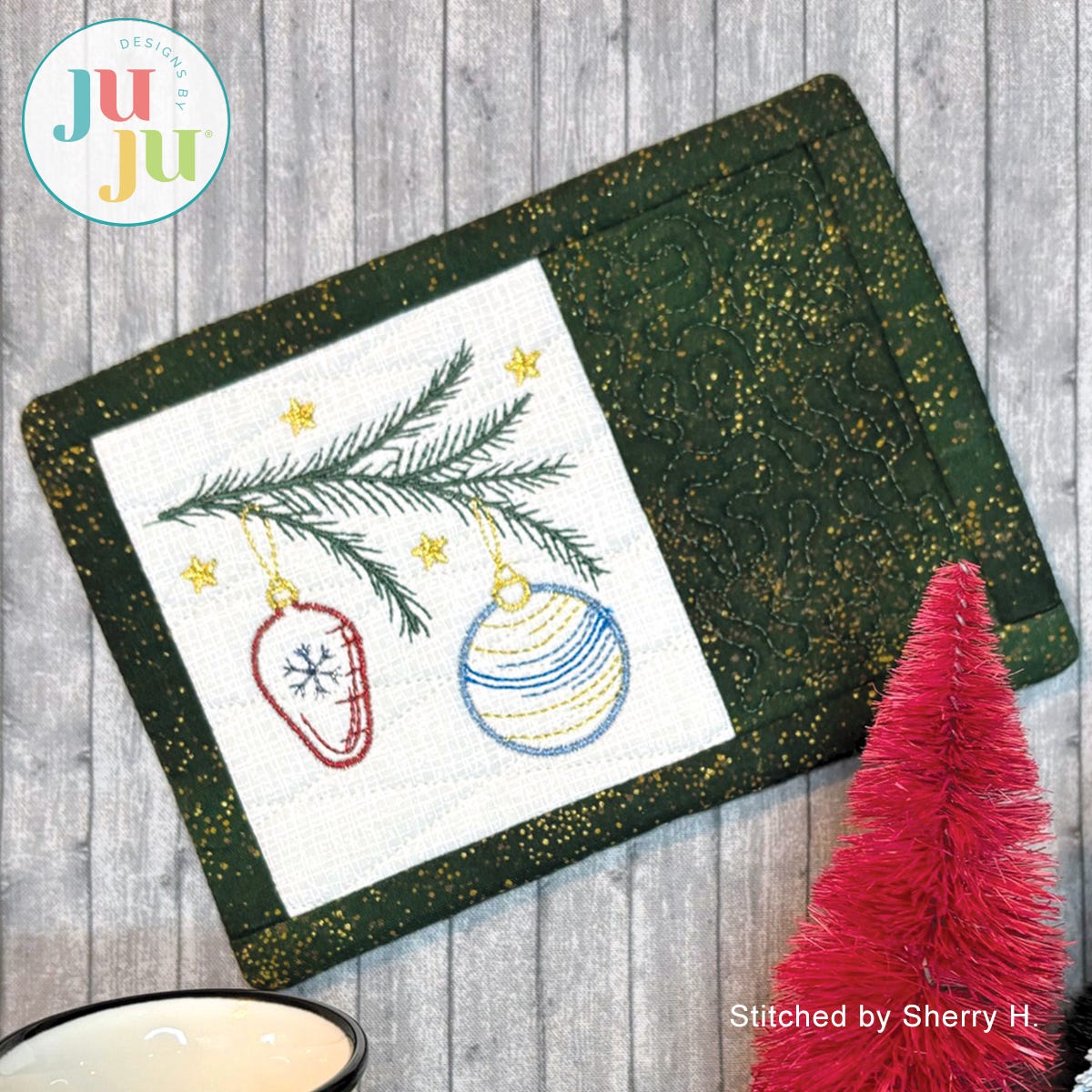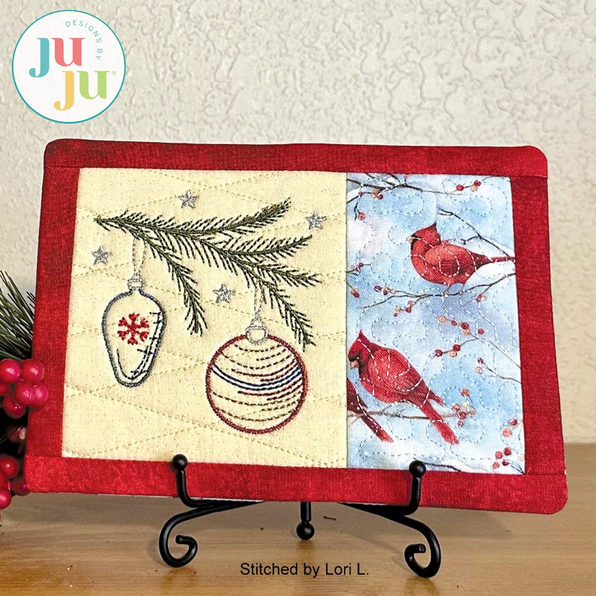 This sketch type mug rug is completely stitched in the hoop; no additional hand or sewing machine stitching required. The various borders are attached during the embroidery process. The left side of the mug rug is quilted in a geometric pattern; the right side is stipple quilted. Use this mug rug as a greeting card and send it to friends and family for Christmas. The mug rug fits perfectly into an A7 envelope. Or display the mug rug on a small easel as a home decoration.