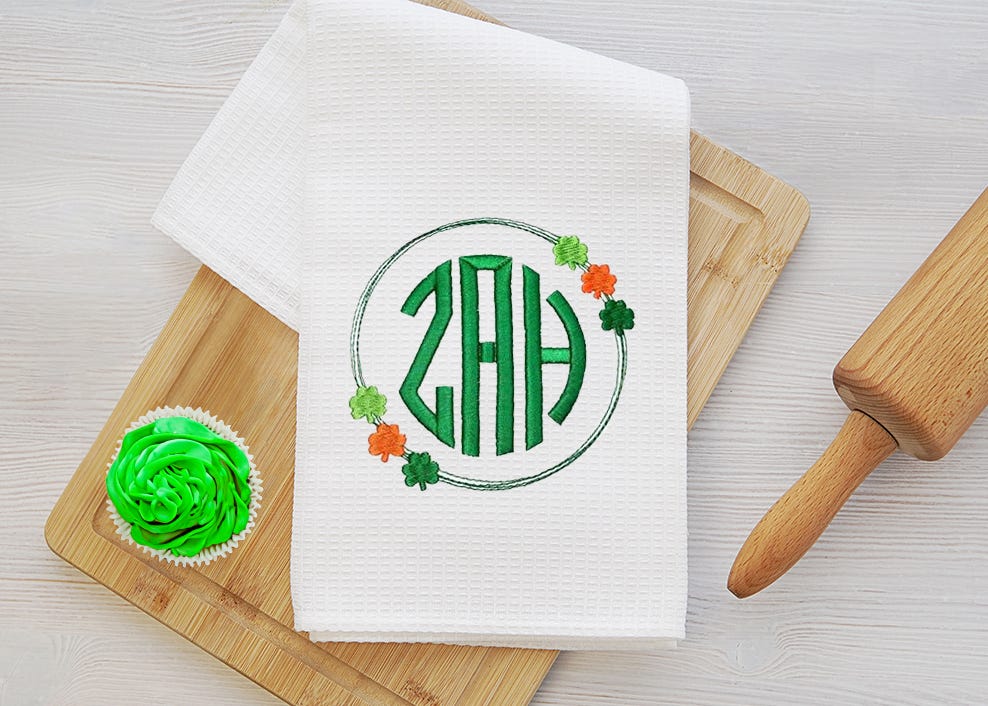 An adorably simple shamrock monogram frame embroidery design, perfect for St. Patrick's Day