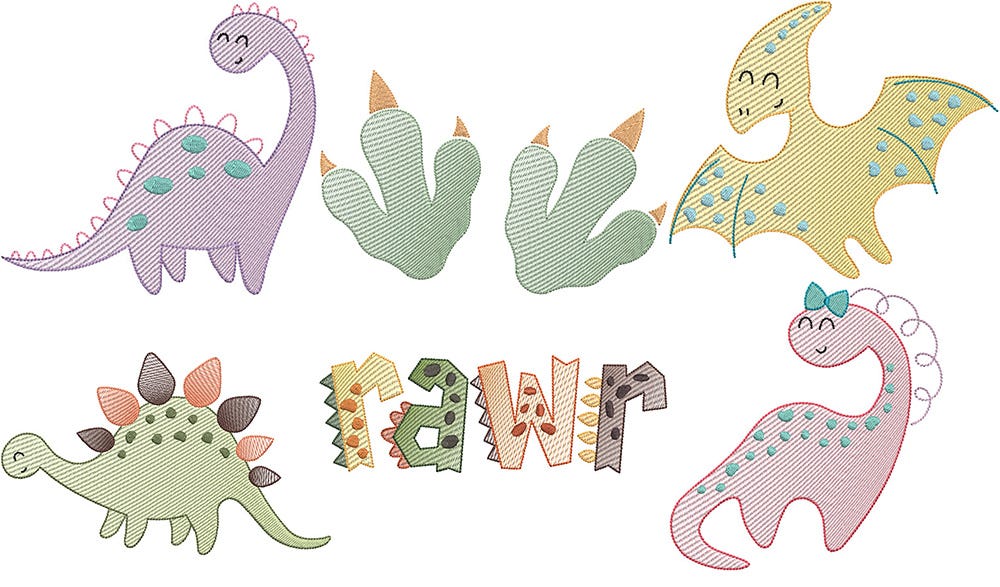 Six adorable dinosaur themed sketch designs! The set includes a cute stegosaurus, pterodactyl, a boy and girl brontosaurus, as well as footprints and the word "rawr". Perfect for boys and girls!