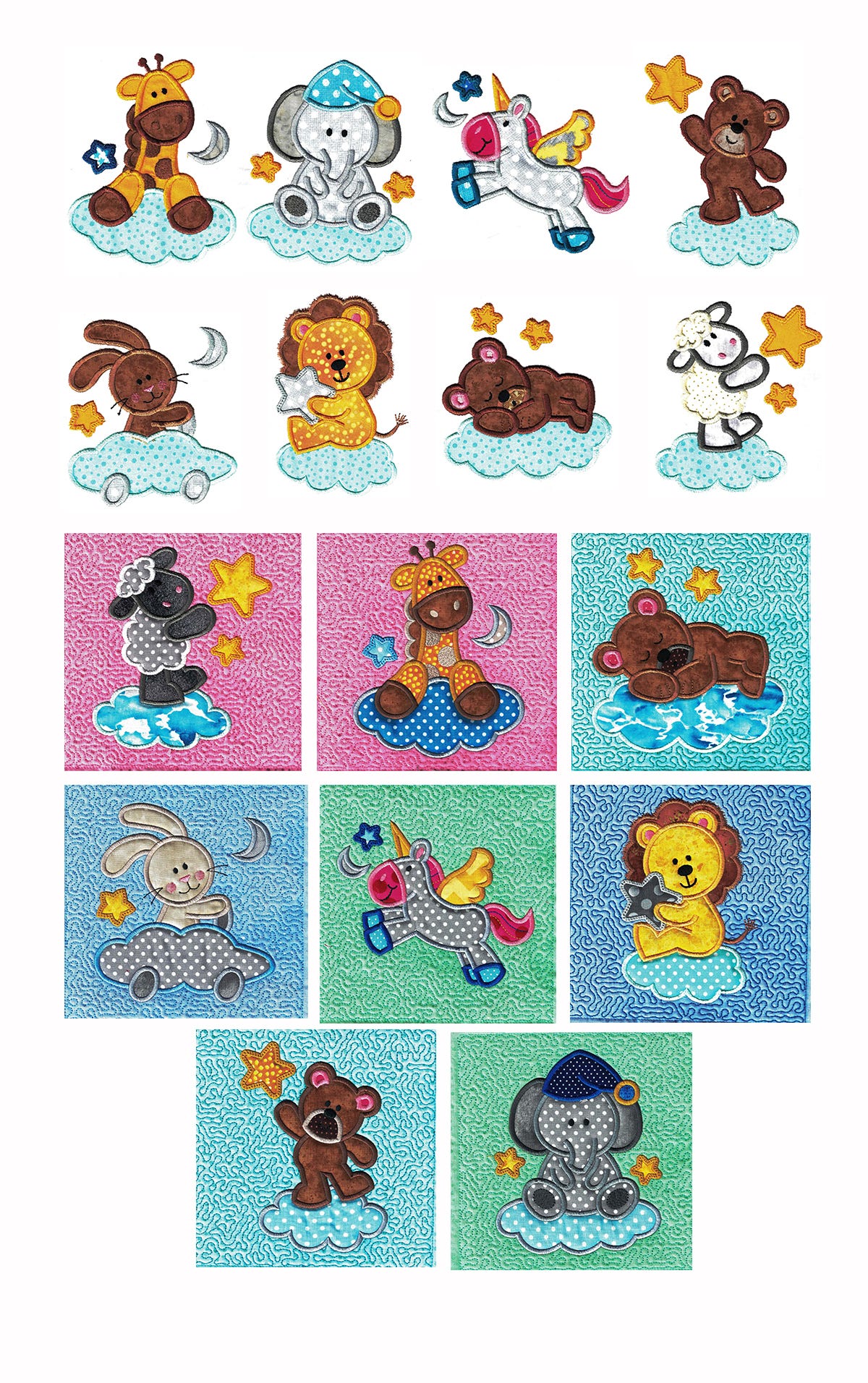 Here is set 2 of 2 seriously adorable sets perfect for the little babies in your life! Our artist, Christopher brown, has come up with 8 simply sweet āsleepy time crittersā on moons, clouds and stars. Alone, they are positively precious as applique. But we took it a step further. Our tester, Margie, is always after me to do our popular applique sets with stipple backgrounds, so here you go.