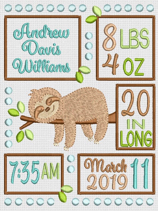Adorable baby sloth birth announcement template. We've included both boy and girl versions in this one. Includes metric versions! Font's in sample are NOT included.