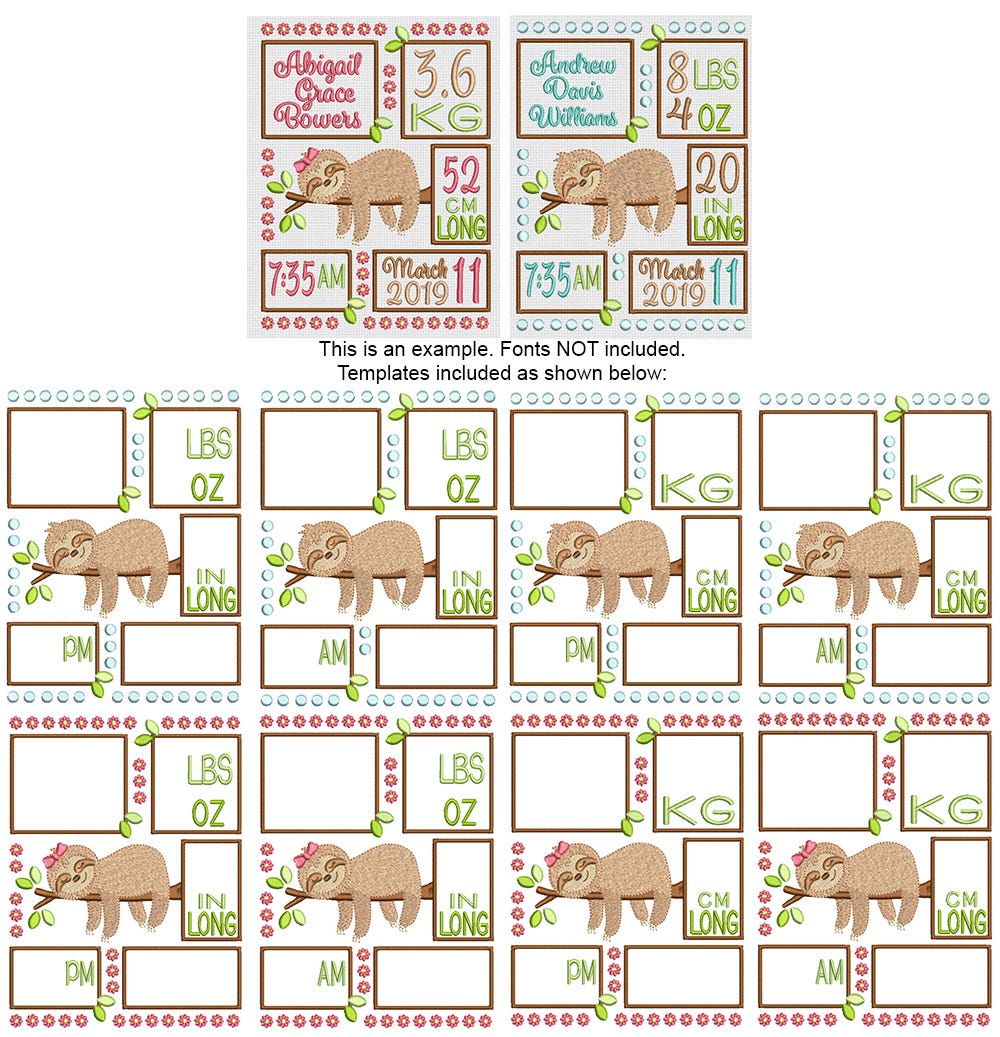You will receive the embroidery templates shown. Customize with your own names, date, weight and length with fonts from your purchased collection or those that are built in to your embroidery software.Ā I have included a "basting" stitch as the first step so that while you are customizing in your software, you can ensure to stay with the parameters of your hoop. Skip the first step upon stitching.