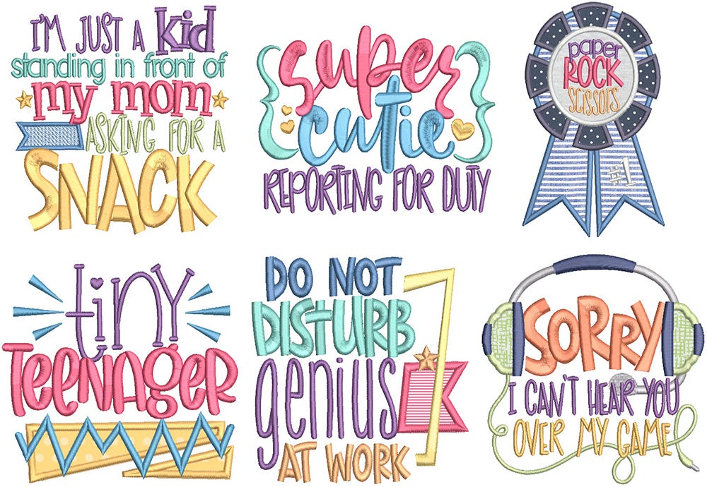 *Please note that the following designs contain applique components:Ā Paper rock scissors / Tiny teenager / Do not disturb genius at work / Sorry I can't hear you over my gameĀ