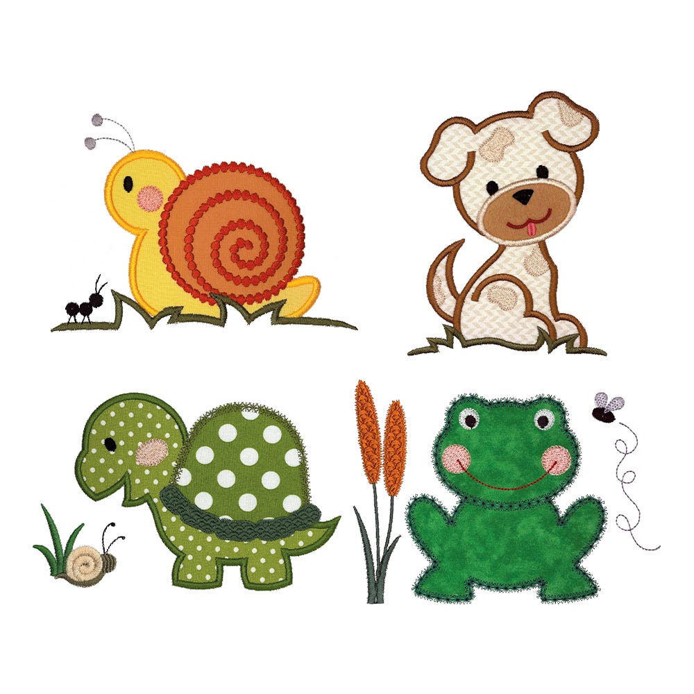 Brighten up baby gifts and nursery stitching with our adorable Snips and Snails Applique design set! This collection includes four sweet applique animals: a puppy, turtle, frog, and snail; perfectly designed to coordinate with our In the Hoop Snips and Snails Baby Quilt.